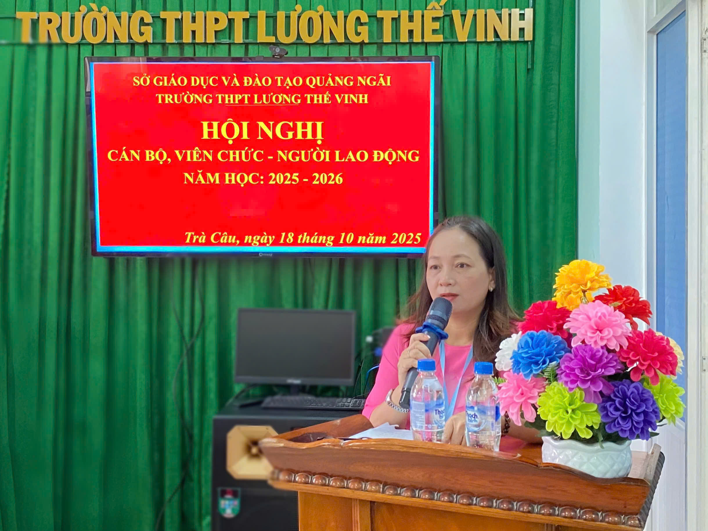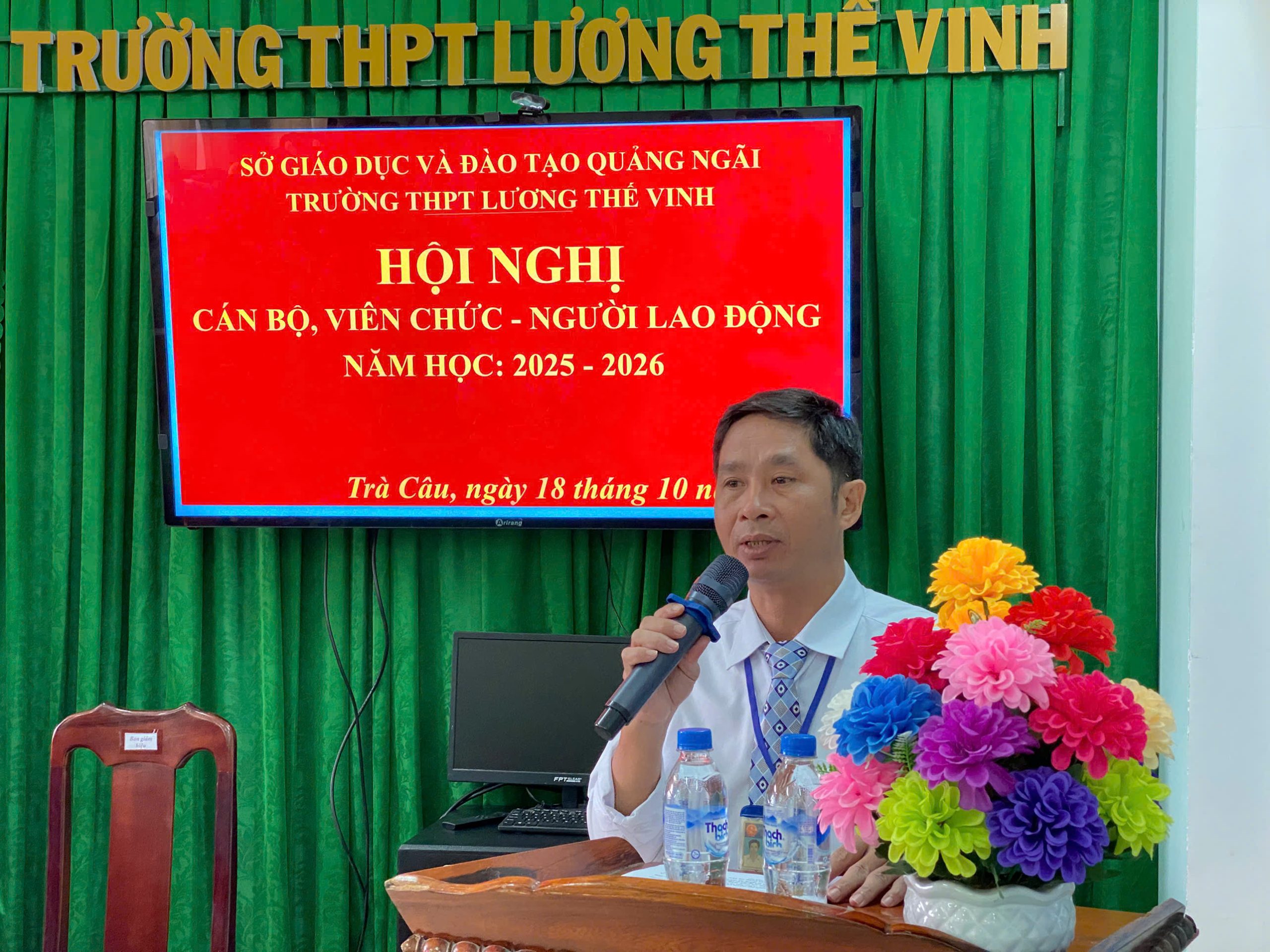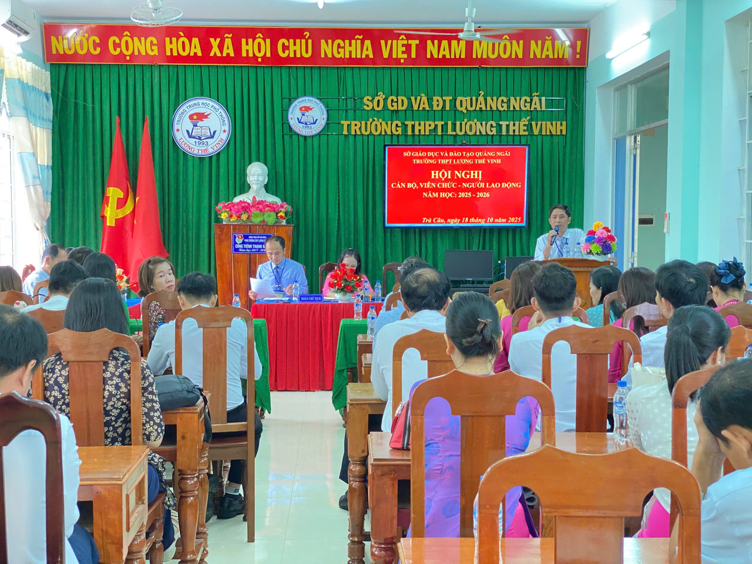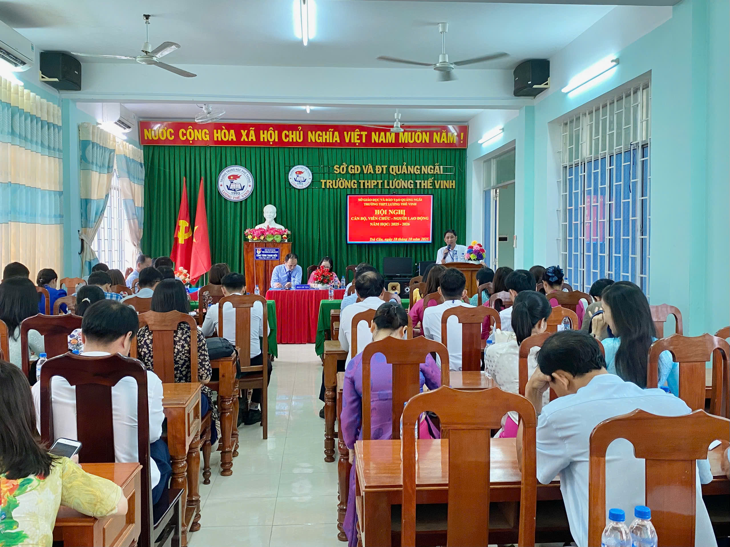 Sáng ngày 18/10/2025, Trường THPT Lương Thế Vinh đã long trọng tổ chức Hội nghị cán bộ, viên chức, người lao động năm học 2025 – 2026. Hội nghị cán bộ, viên chức, người lao động là hoạt động thường niên của Nhà trường, một mặt nhằm đánh giá, tuyên dương kết quả đã được trong công tác giáo dục của năm học trước, mặt khác nghiêm túc rút ra nguyên nhân của những hạn chế, tồn tại; từ đó, đề ra phương hướng hoạt động phù hợp cho năm học mới. Đây cũng là dịp để mỗi thành viên trong hội đồng sư phạm Nhà trường thực hiện quyền dân chủ đề xuất ý kiến, bày tỏ nguyện vọng với lãnh đạo Nhà trường. Trực tiếp đặt vấn đề để cùng thảo luận và tìm tiếng nói đồng thuận, đồng tâm, chung sức phát triển sự nghiệp giáo dục của Nhà trường.
